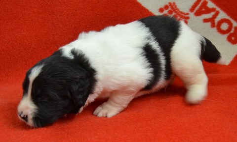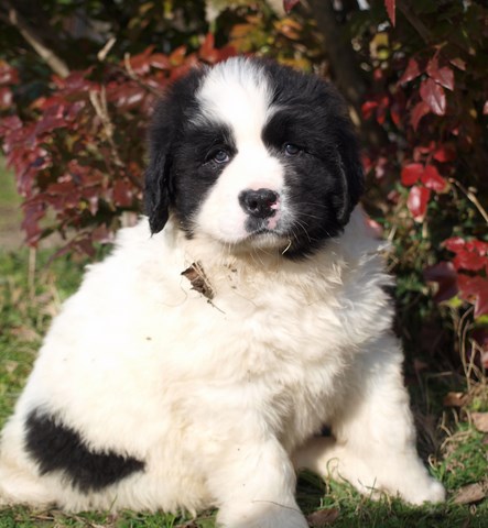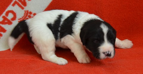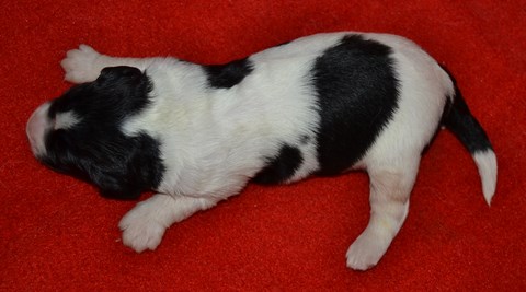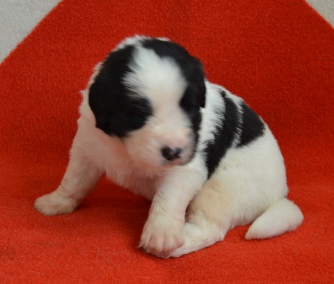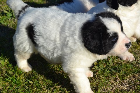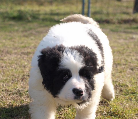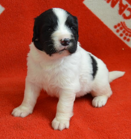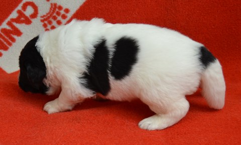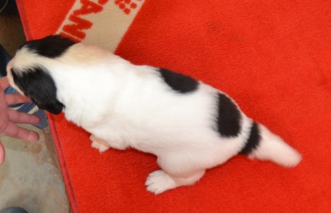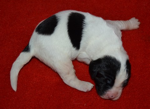 chiot plutôt blanc avec une belle liste et 3 jolies taches noires, très costaud.