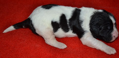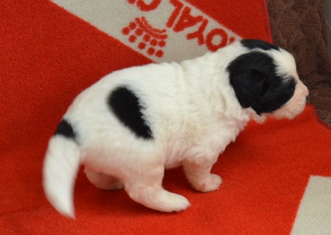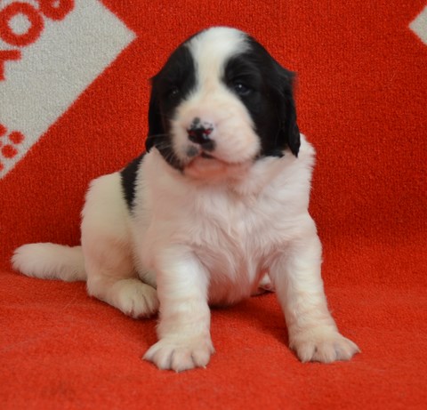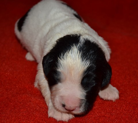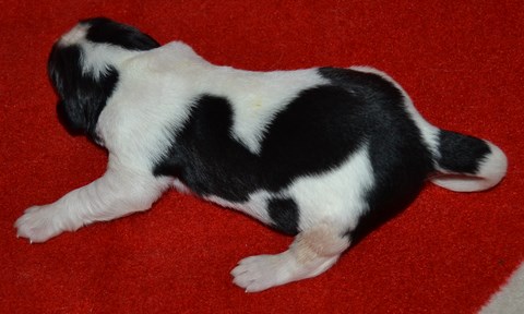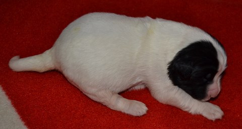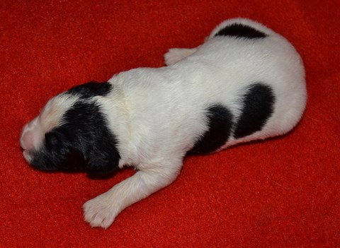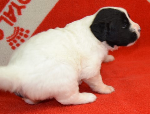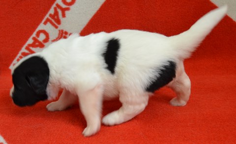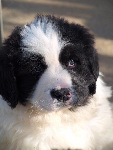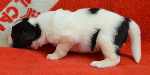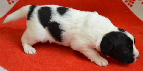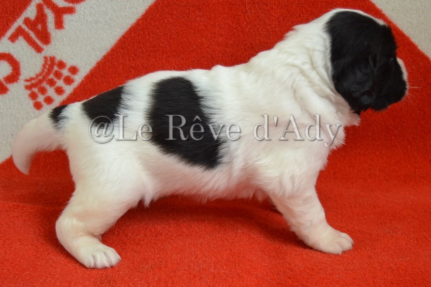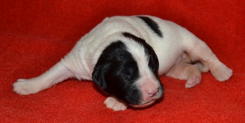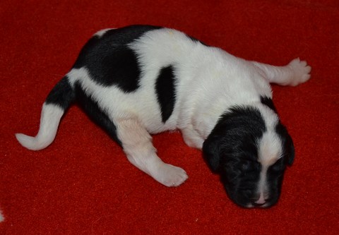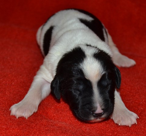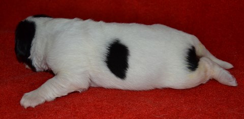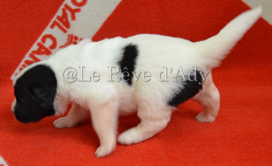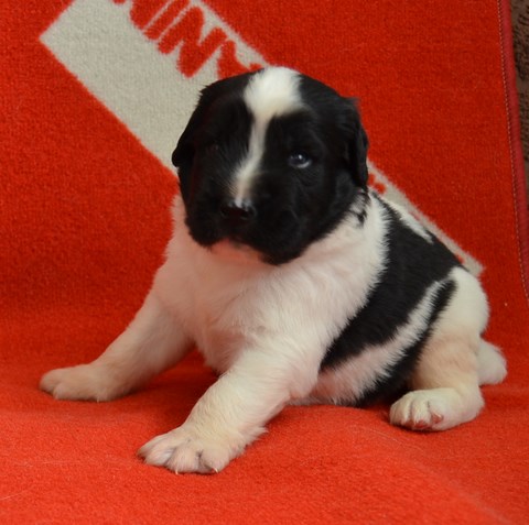 chiot plutôt blanc avec une belle liste et 3 jolies taches noires, très costaud.